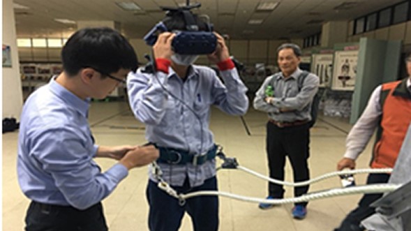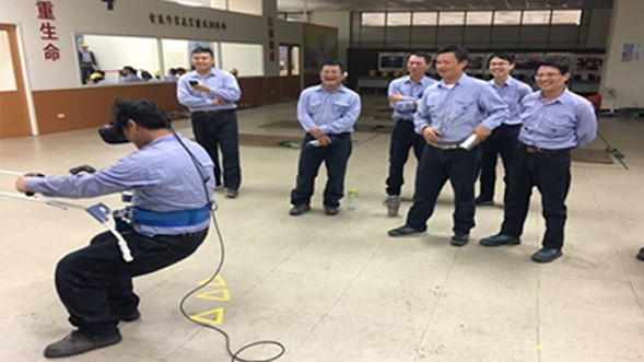 台電「訓練所鐵塔登高VR模擬訓練教材」,本專案建置一款互動式「鐵塔登高VR模擬訓練系統」,搭配HTC VIVE暨無線模組,在虛擬實境中,以沉浸式體驗學習加上感官刺激的教育訓練,學員於不同的場景如:40米與60米高塔、田園、峽谷…等場景實際操作任務,讓新進人員在進入真實工作現場之前,先透過VR模擬訓練於高空工作的感官刺激,協助學員克服環境落差之心理因素。