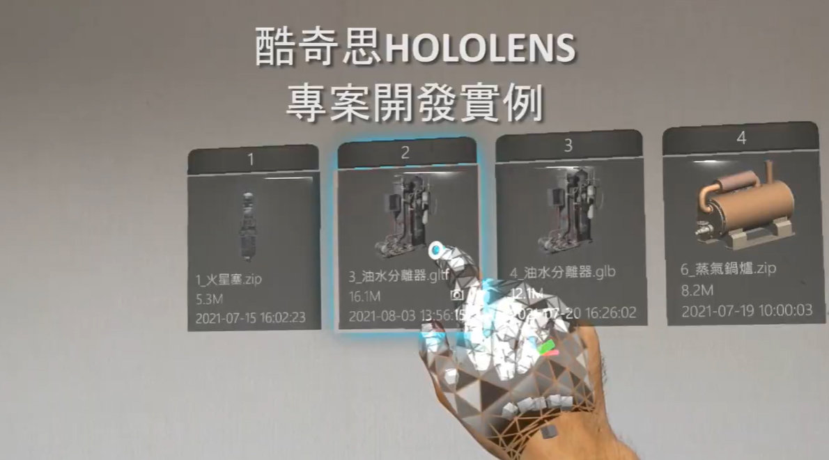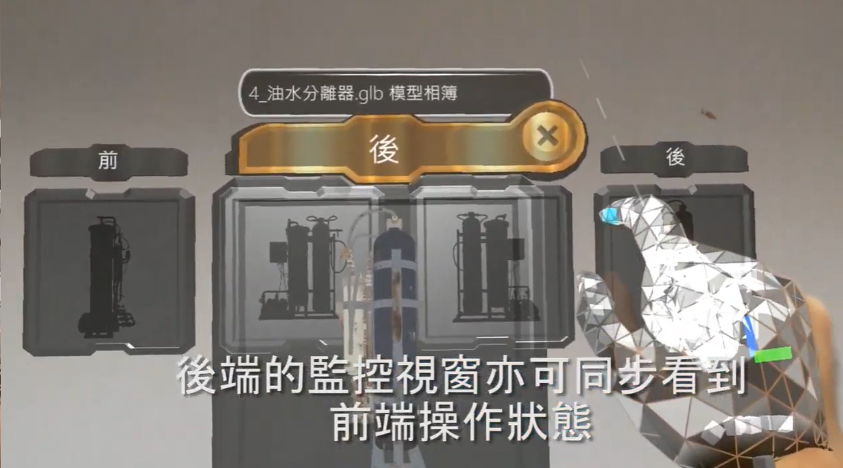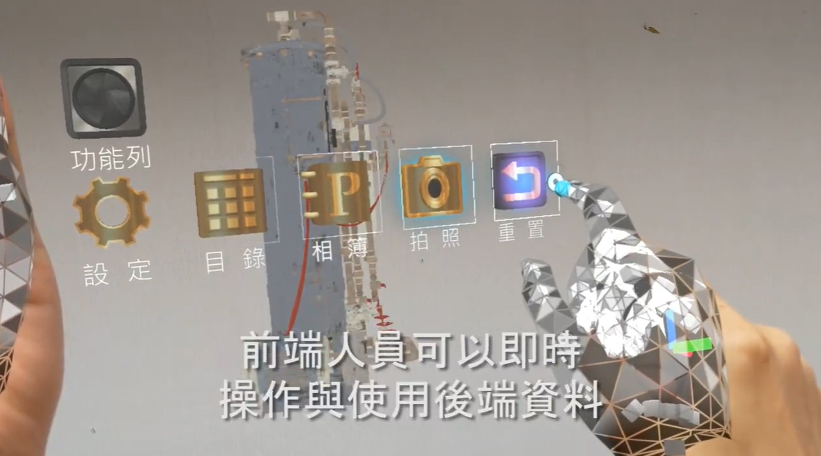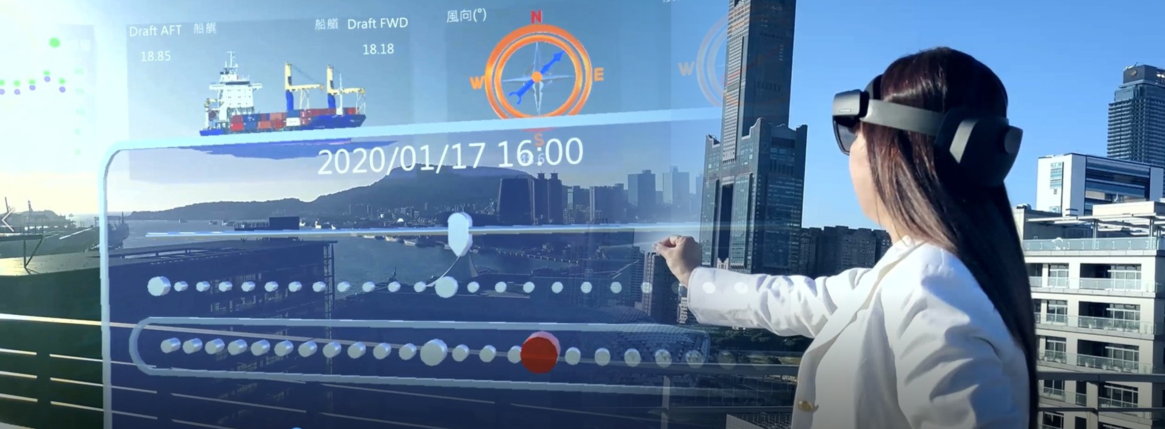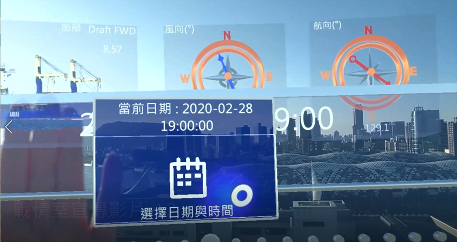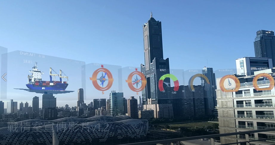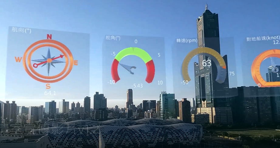 本專案為船舶混合實境前導應用系統,於Hololens 2環境下,有提供下拉表單時間選擇,呈現相對時間之應視覺化儀表板:對地船速、對水船速、轉速、馬力/油料、舵角、船路徑線方向等視覺化圖表。對於船舶遠洋航行提供直覺即時訊息,未來亦可遠端連線打造總裁式的虛擬戰情室。