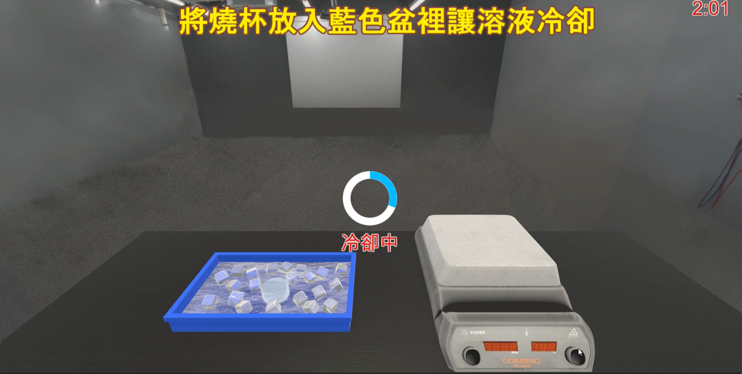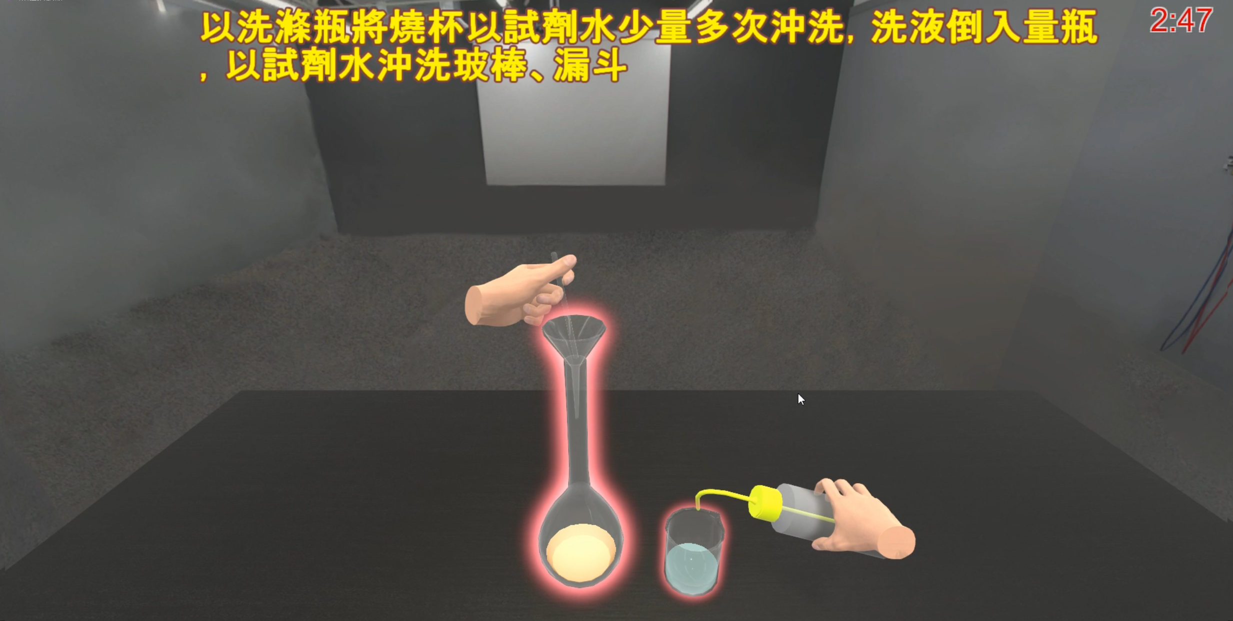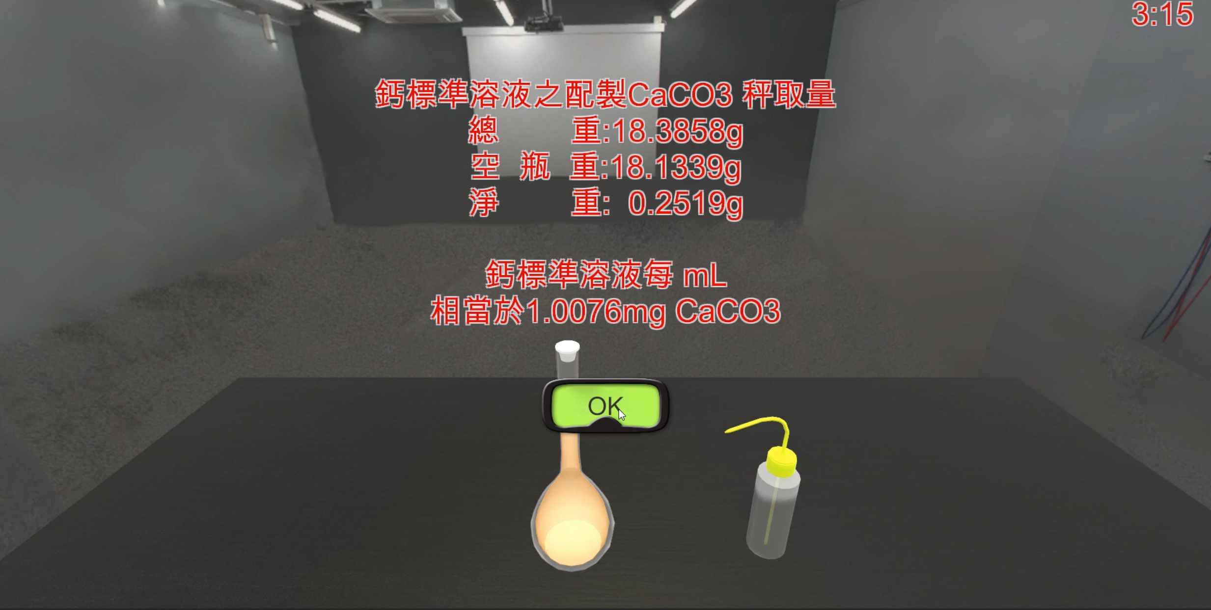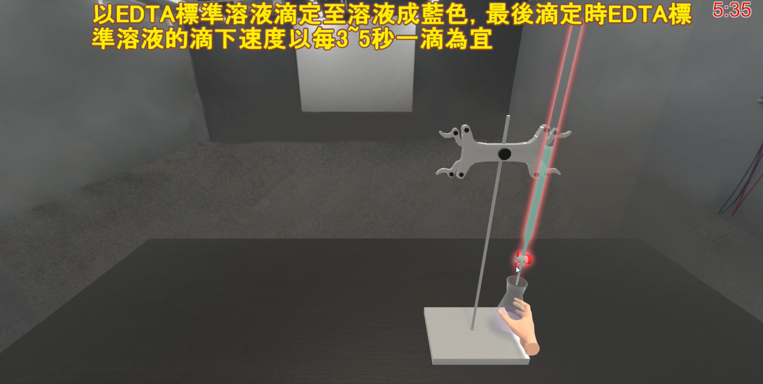 本專案旨在讓學生不受實驗室限制透過VR操作,熟練水硬度之測定標準實驗流程。課程以(化學丙級證照考題---水硬度之測定)作為基礎,模擬:鈣標準溶液之配製、EDTA 標準溶液之標定、樣品硬度之測定,最後有分數計算,使用者完成所有的數據填答後,按完成扭, 系統計算成績並顯示於畫面上。