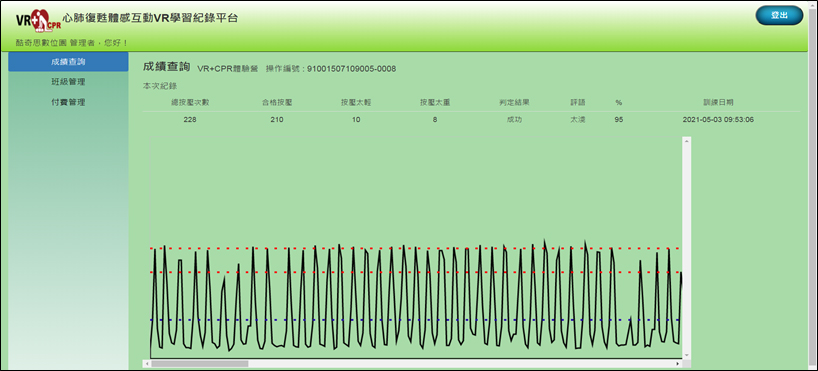 3. 學員操作j有詳細數據記錄,每一次按壓轉換成壓力波形圖,提供專業醫師與教授作為遠端教學的分析參考。